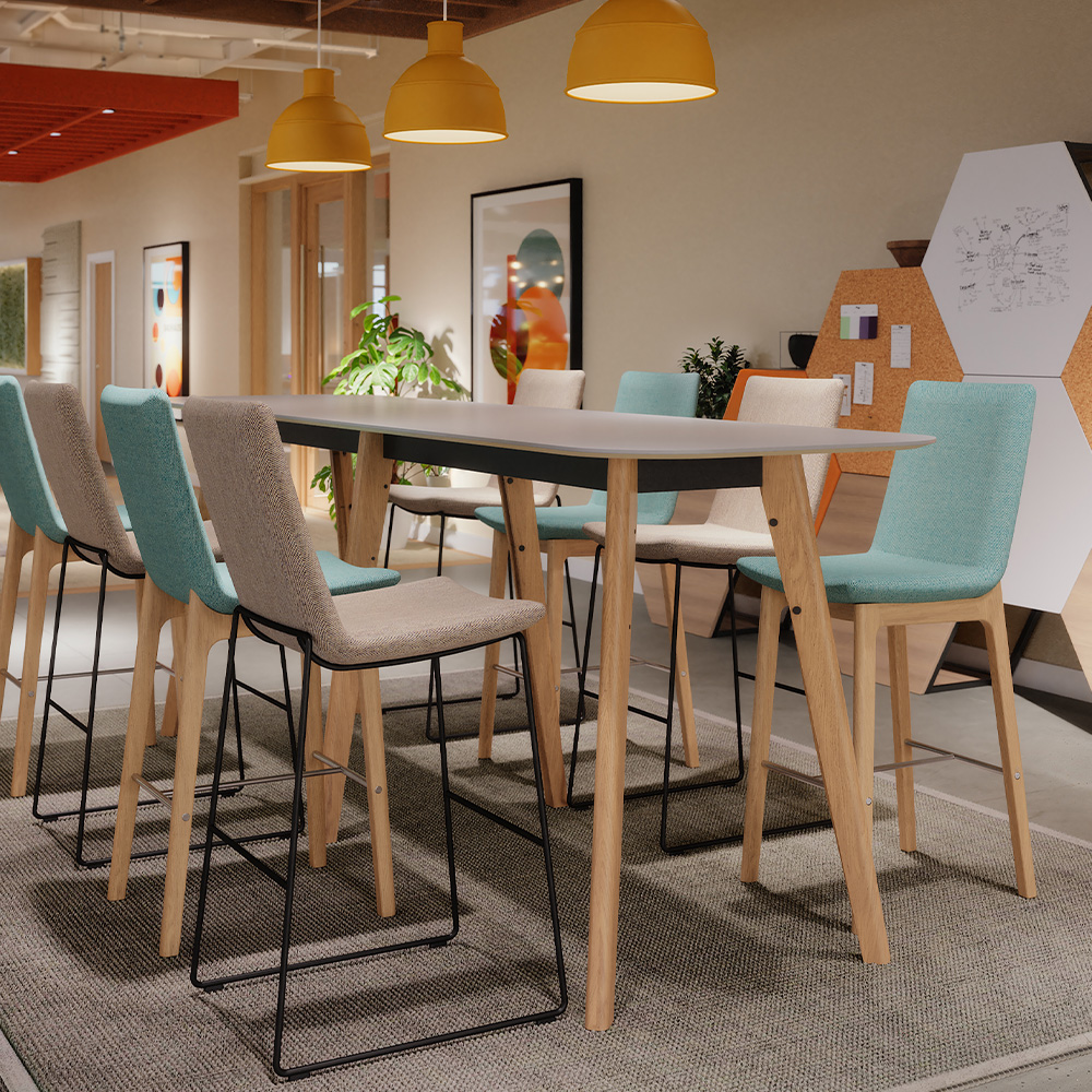 Swoosh baaripukid koostöölaua ümber – mugav iste ja kvaliteetsed materjalid loovad kutsuva keskkonna meeskonnatööks.